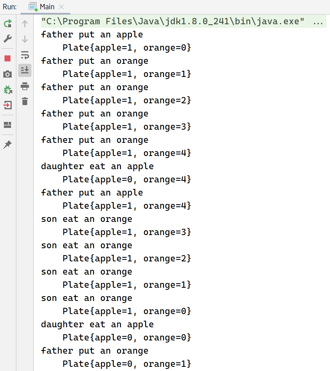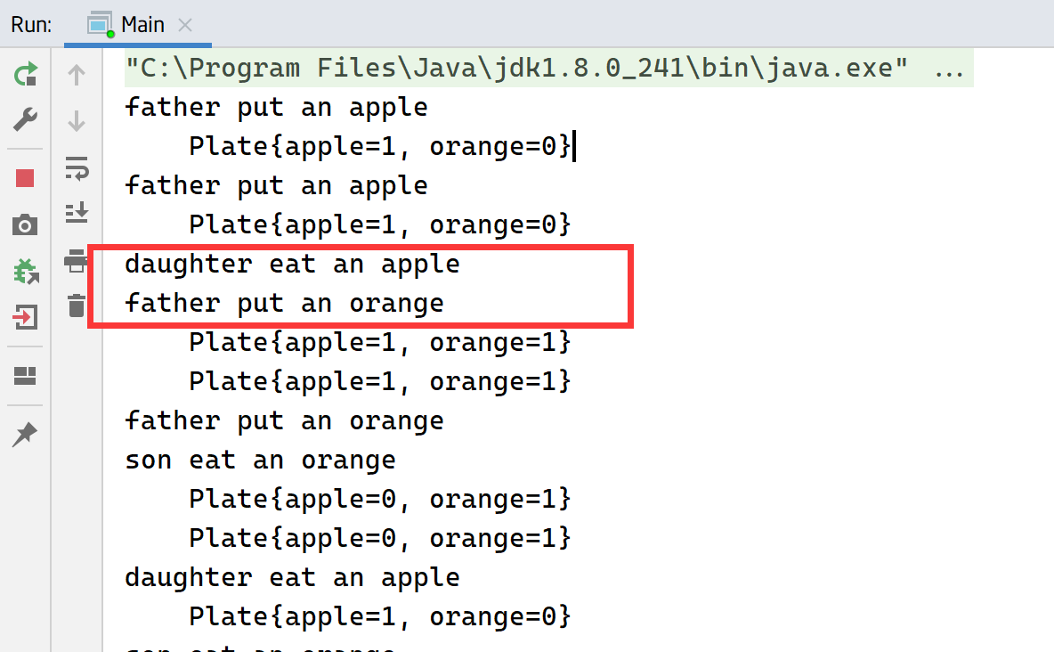 1 2 3 4 5 6 7 8 9 10 11 12 13 14 empty.acquire(); if (random.nextBoolean()) { plate.putApple(); System.out.println("father put an apple" ); System.out.println("\t" + plate); apple.release(); } else { plate.putOrange(); System.out.println("father put an orange" ); System.out.println("\t" + plate); orange.release(); }