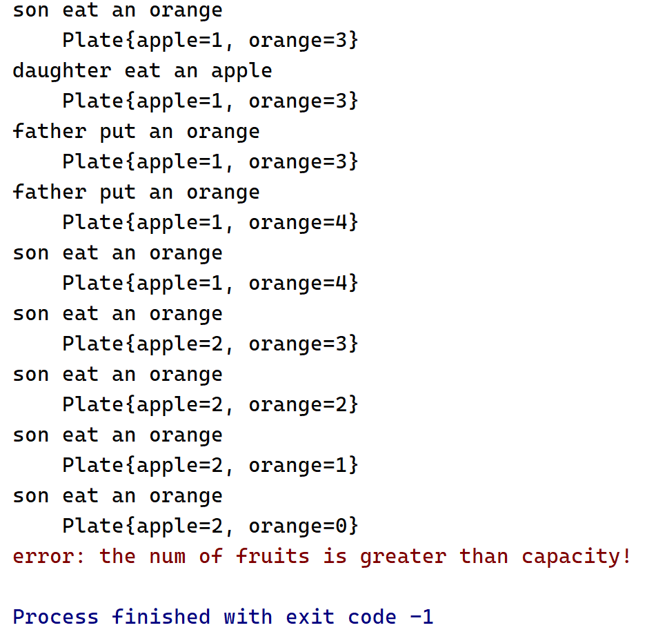 1 2 3 4 5 6 7 8 9 private void checkCapacity () { if (apple + orange > capacity) { System.err.println("error: the num of fruits is greater than capacity!" ); System.exit(-1 ); } else if (apple < 0 || orange < 0 ) { System.err.println("error: the num of fruits should not be minus!" ); System.exit(-2 ); } }